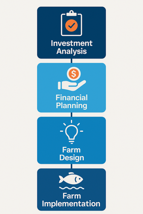 ماموریت ما صرفاً تهیه طرح نیست. ما از مرحله انتخاب زمین یا نقطه آبی تا: طراحی سازهها و سیستمها تأمین تجهیزات آموزش پرسنل مدیریت دورههای اولیه تولید بازاریابی و فروش محصول