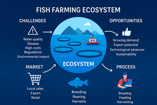 1. چالشها (Challenges) اکوسیستم پرورش ماهی با چالشهای ساختاری، اقتصادی و زیستمحیطی روبهرو است که باید از ابتدا بهدرستی تحلیل شوند: نوسان دمای آب و تأثیر آن بر رشد و تلفات کیفیت آب (اکسیژن محلول، آمونیاک، شوری) هزینه بالای خوراک که ۵۰–۷۰٪ هزینه جاری فارم را تشکیل میدهد دسترسی دشوار به مجوزها، بهویژه در مناطق حساس زیستمحیطی ریسکهای بیماری و تلفات محدودیت بازار فروش و نوسان قیمتها رقابت شدید در برخی گونهها مانند قزلآلا سرمایه اولیه بالا در سیستمهای مدرن مثل RAS