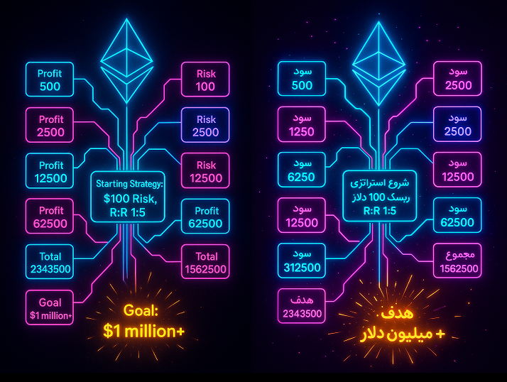 This strategy is based on exponential capital growth through winning trades with a fixed risk-to-reward ratio (1:5). The trader starts with an initial risk of $100 and, after two successful trades, increases the risk to match the profit from the previous trade. This approach accelerates capital growth rapidly, and calculations show that if all trades are successful, it can generate over $2.34 million in profit within 11 trades. The main advantage of this strategy is maximizing compounding profits while requiring only a small initial investment.